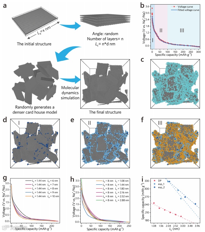 图5利用机器学习模型,预测了不同碳相的演变对钠离子存储性能的影响。通过分子动力学模拟和实验数据验证,研究团队明确了石墨微区的层间距变化与储能性能的关联。