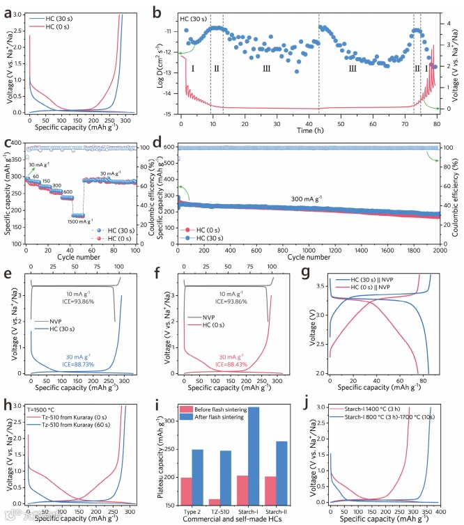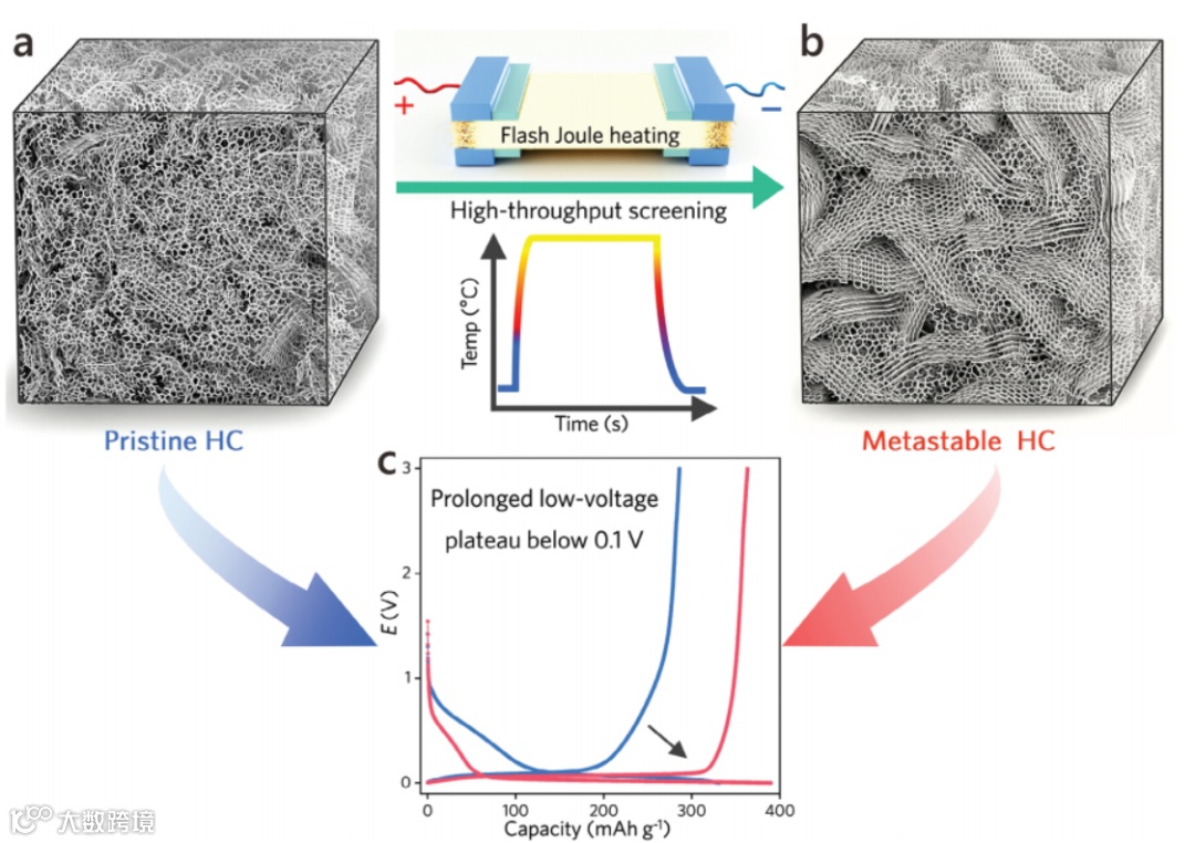 图1展示了通过瞬态烧结技术对硬碳材料的碳相精准调控过程。通过这种技术,硬碳中的结晶碳、非晶碳以及纳米孔得到了优化,显著延长了材料在低电压下的放电平台。
