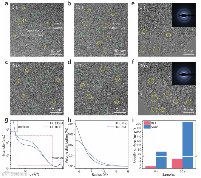 图3通过高分辨率透射电子显微镜(HRTEM)和小角X射线散射(SAXS)技术,展示了硬碳材料在不同热脉冲处理后的微观结构变化,特别是石墨微区和封闭纳米孔的演变情况。