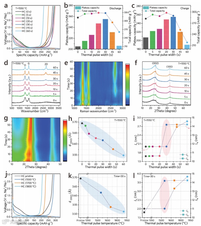 图2揭示了在不同热脉冲处理条件下,硬碳材料的碳相变化及其对钠存储性能的影响。研究表明,调控热脉冲宽度和温度能够优化材料的储能效果,提升首次放电容量。
