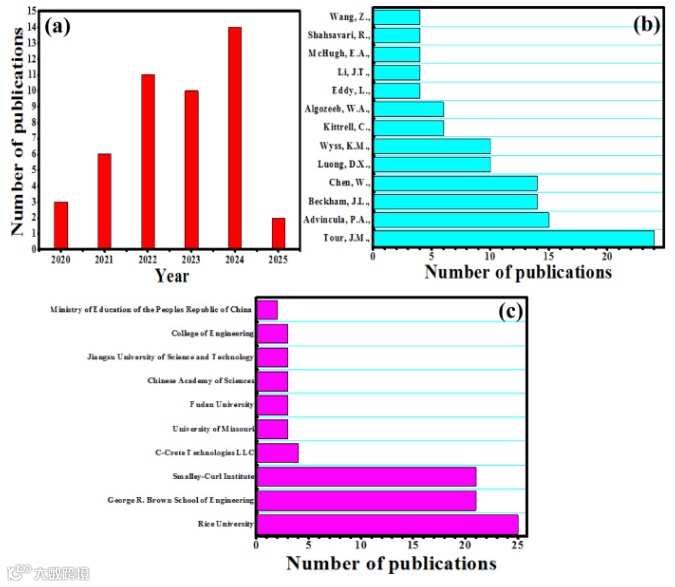 图1. 过去四年发表的FG文章数量(a),以及对这些出版物的主要贡献研究人员(b)和研究机构/大学(c)。
