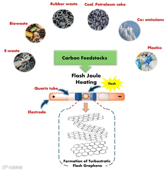 在当今全球工业化快速发展的背景下,废弃物处理已成为一个亟待解决的环境难题。传统的废弃物处理方式不仅占用大量土地资源,还导致严重的环境污染和温室气体排放。与此同时,石墨烯作为一种具有卓越性能的二维材料,因其在电子、能源和材料科学等领域的广泛应用而备受关注。然而,传统的石墨烯生产方法通常依赖于高能耗和复杂的化学处理过程,这限制了其大规模应用。在此背景下,闪蒸焦耳热(Flash Joule Heating, FJH)技术应运而生,为废弃物处理和石墨烯的可持续生产提供了一种创新途径。