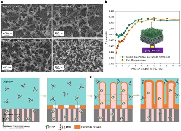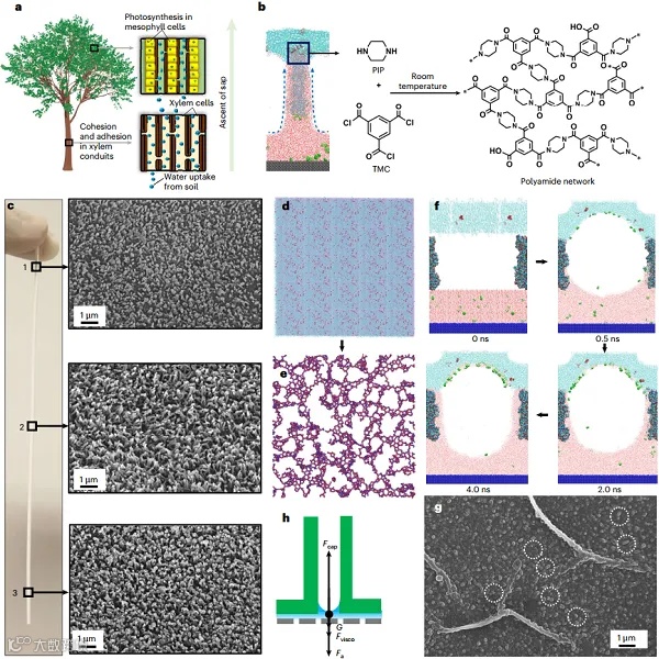 该膜具备独特的分层结构,其表面为二维纳米膜,而表面生长的纳米管进一步增强了水的传输能力。研究表明,这种创新的膜结构显著增加了单位投影面积上的有效水传输面积,使得膜的水盐分离性能远超目前最先进的膜材料。通过分子动力学模拟和对照实验,研究团队发现两种单体分子在反应初期自发组织成二维纳米孔网络,而纳米管的向上生长则由纳米孔内的毛细作用驱动。