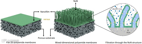 图1: 具有NoN结构的混合维聚酰胺膜示意图与传统二维聚酰胺膜的对比