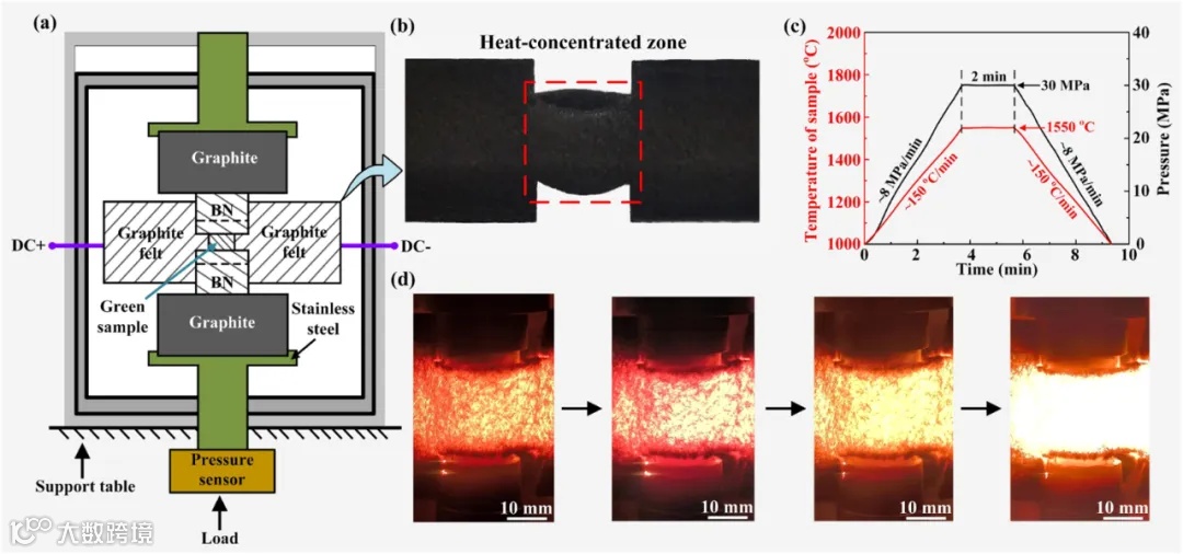 通过直接焦耳加热石墨毡,UPS技术在较低的温度(1550°C)和极短的时间(≤2分钟)内完成B4C陶瓷的致密化。 -