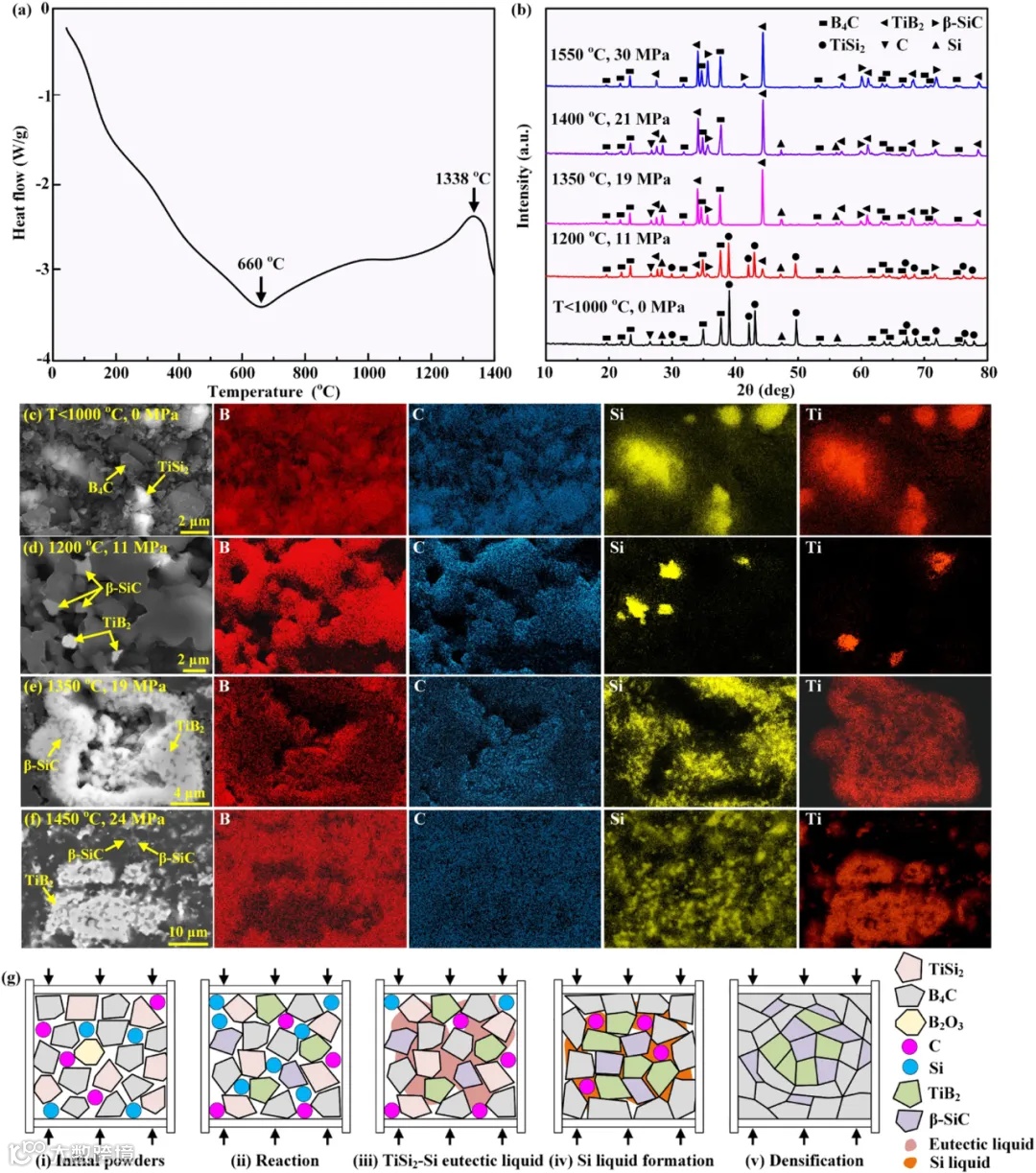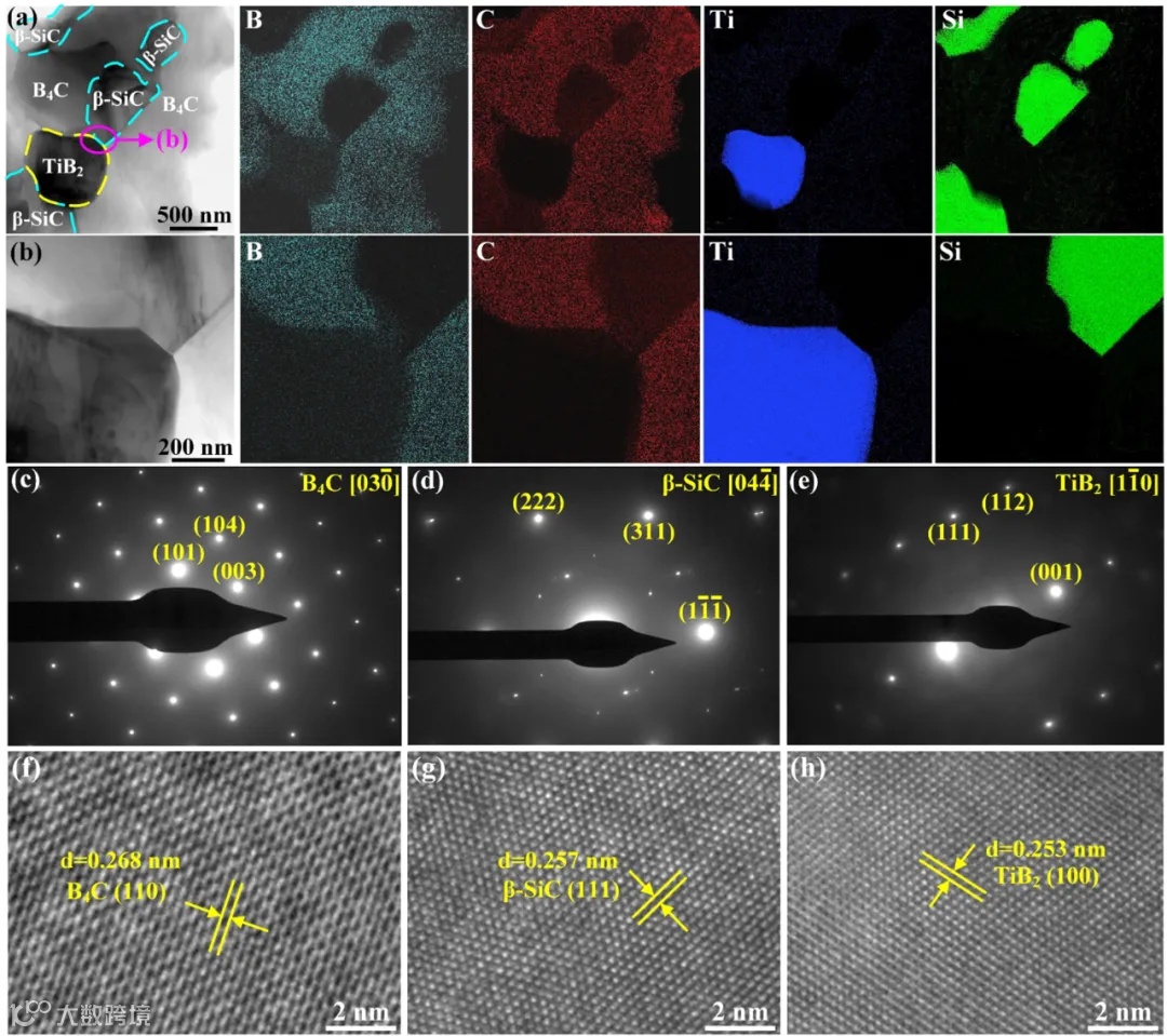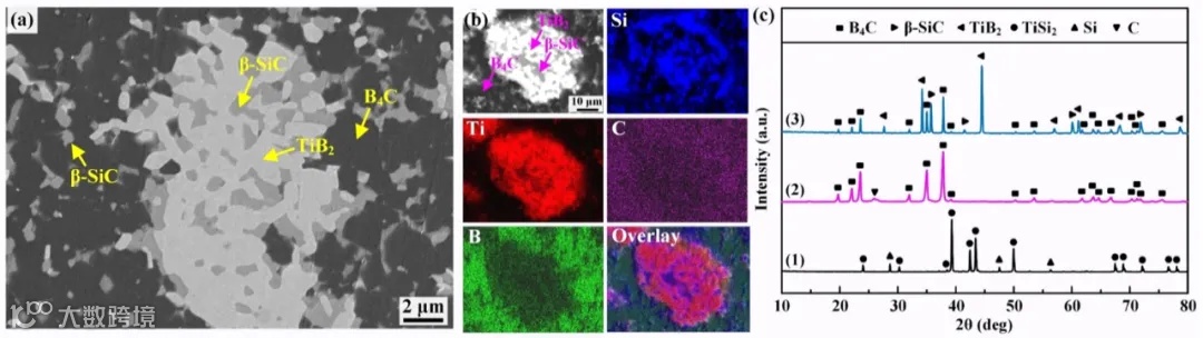 元素分布(图3):EDS显示B4C、SiC和TiB2相均匀分布,TiSi2完全反应。