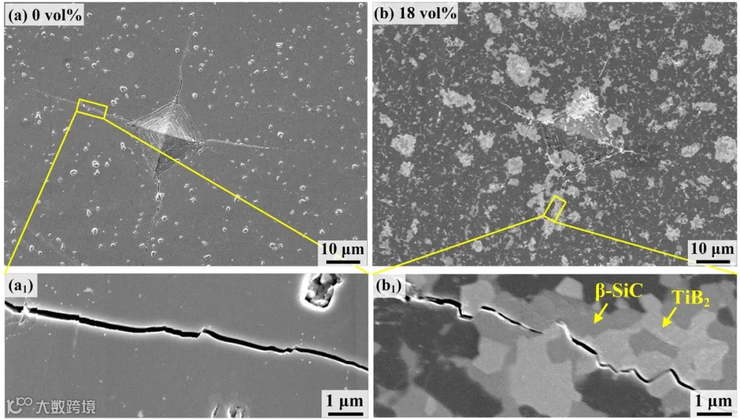 裂纹偏转(图6):TiB2相引入后,裂纹路径更偏转化,增强了断裂韧性。 -