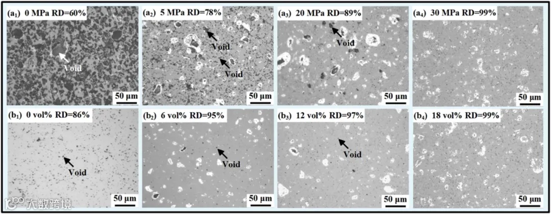 施加的压力进一步引导液相填充孔隙,实现样品的高度致密化。