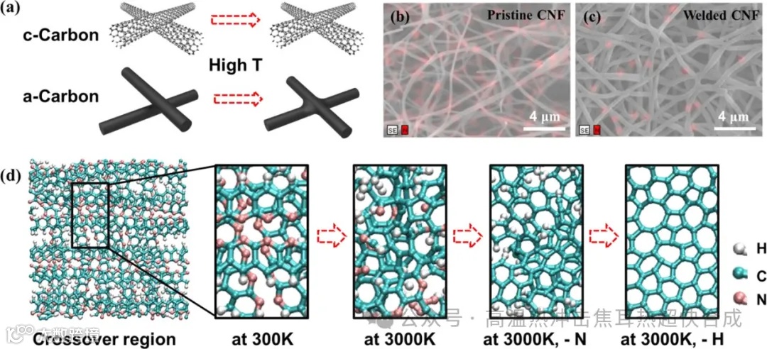 图4 通过分子动力学模拟,展示了在纤维节点处的碳焊接行为,以及原始CNF和焊接CNF的氮元素分布图,说明了焦耳加热过程中氮和氢的去除促进了石墨化结构的形成。