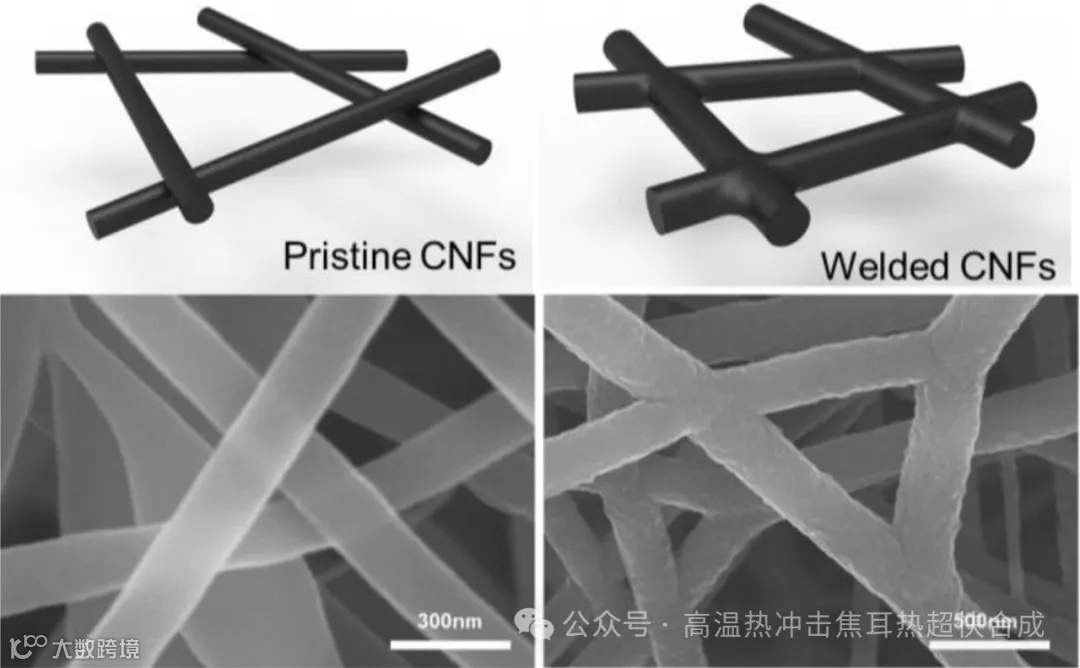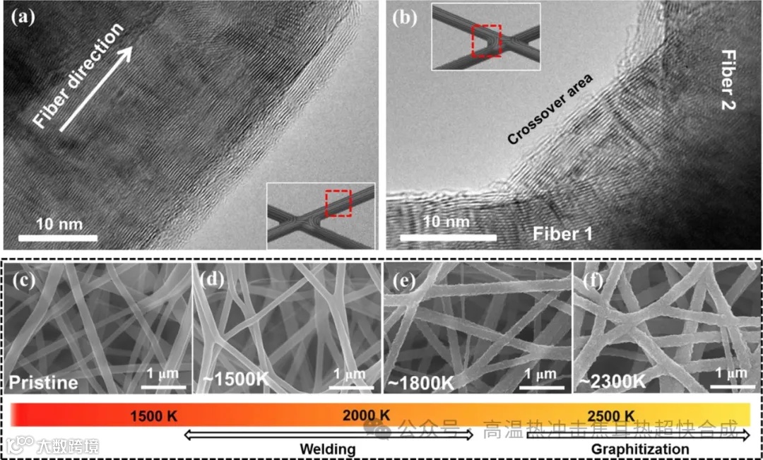 图3 通过高分辨透射电镜(HR-TEM)和SEM图像,进一步展示了焊接CNF结构的形态特征,以及在不同焦耳加热温度下CNF形态的演变,证实了在1500至2300 K温度范围内CNF的融合过程。