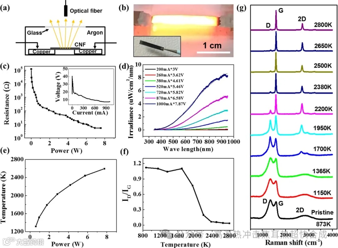 图2 展示了焦耳加热实验的设置和温度测量,以及CNF膜在不同输入功率下的发光行为。通过光谱拟合,我们能够精确测量CNF膜的温度,并发现随着输入功率的增加,CNF膜的电阻率显著下降,这与材料的电导率提高相对应。