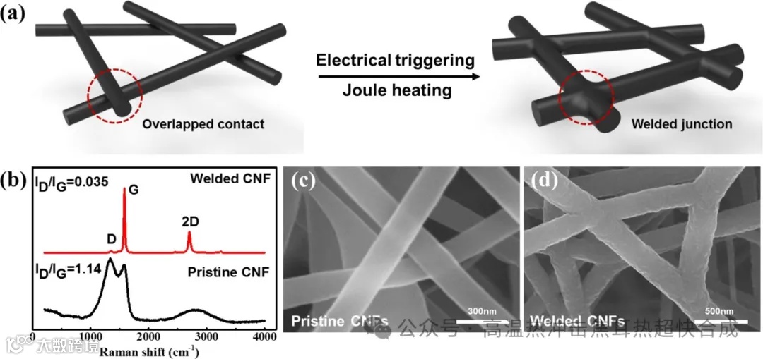 图1 展示了通过焦耳加热触发的碳焊接过程示意图以及拉曼光谱和扫描电镜(SEM)图像。原始CNF经过焦耳加热后,其晶体结构和拉曼光谱中的D波段和G波段的变化表明了石墨化程度的提高。SEM图像进一步揭示了CNF在节点处的焊接现象,说明了焦耳加热如何促进了CNF之间的物理接触转变为牢固的化学键合。