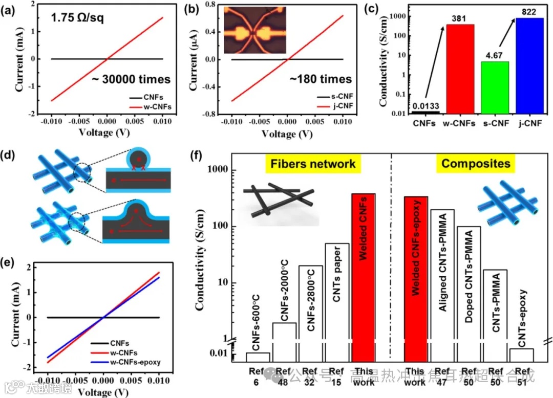 图5 展示了焊接CNF结构的电导率测量结果,以及原始CNF膜、焊接CNF膜、单根CNF以及经过焦耳加热的单根CNF的电导率对比。此外,还展示了聚合物浸渍后CNF的电导率变化,以及与其他纤维网络和纤维-聚合物复合材料的电导率比较,证明了焊接CNF膜在导电性能上的显著优势。