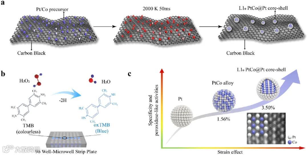 图 1 核壳结构设计与合成验证 :利用焦耳加热技术(升温速率达 10⁵ K/s),在碳黑基底上一步合成 L1₀ 相 PtCo@Pt 核壳纳米酶。瞬时高温(约 2000 K)诱导前驱体快速成核,借助 Pt 与 Co 表面能差异,使多余 Pt 原子自发包覆于 PtCo 金属间化合物核表面,生成厚度均匀的超薄 Pt 壳层。热重分析(TGA)确认碳黑载体中 PtCo 负载量达 50 wt%,证实材料热稳定性。调节焦耳加热参数,制备出多种对比样品,L1₀ PtCo@Pt 核壳结构因界面晶格压缩(3.5% 应变)展现最佳应变效应。