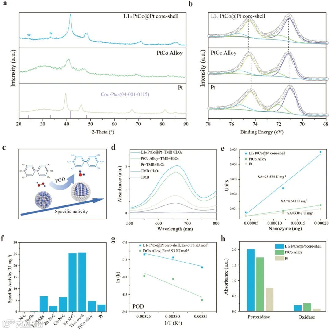 图 3 晶体结构与电子态分析 :X 射线衍射(XRD)显示 L1₀ PtCo@Pt 特征峰与标准卡片匹配,彰显高度有序金属间化合物结构。X 射线光电子能谱(XPS)表明,相较于纯 Pt,L1₀ PtCo@Pt 中 Pt 4f 轨道结合能负移,意味着 Co 向 Pt 电子转移,优化表面电子态。催化性能测试显示,L1₀ PtCo@Pt 过氧化物酶样活性为纯 Pt 的 17.4 倍,氧化酶样活性近乎为零,阿伦尼乌斯曲线揭示其活化能显著低于 PtCo 合金,凸显应变效应降低反应能垒之功效。