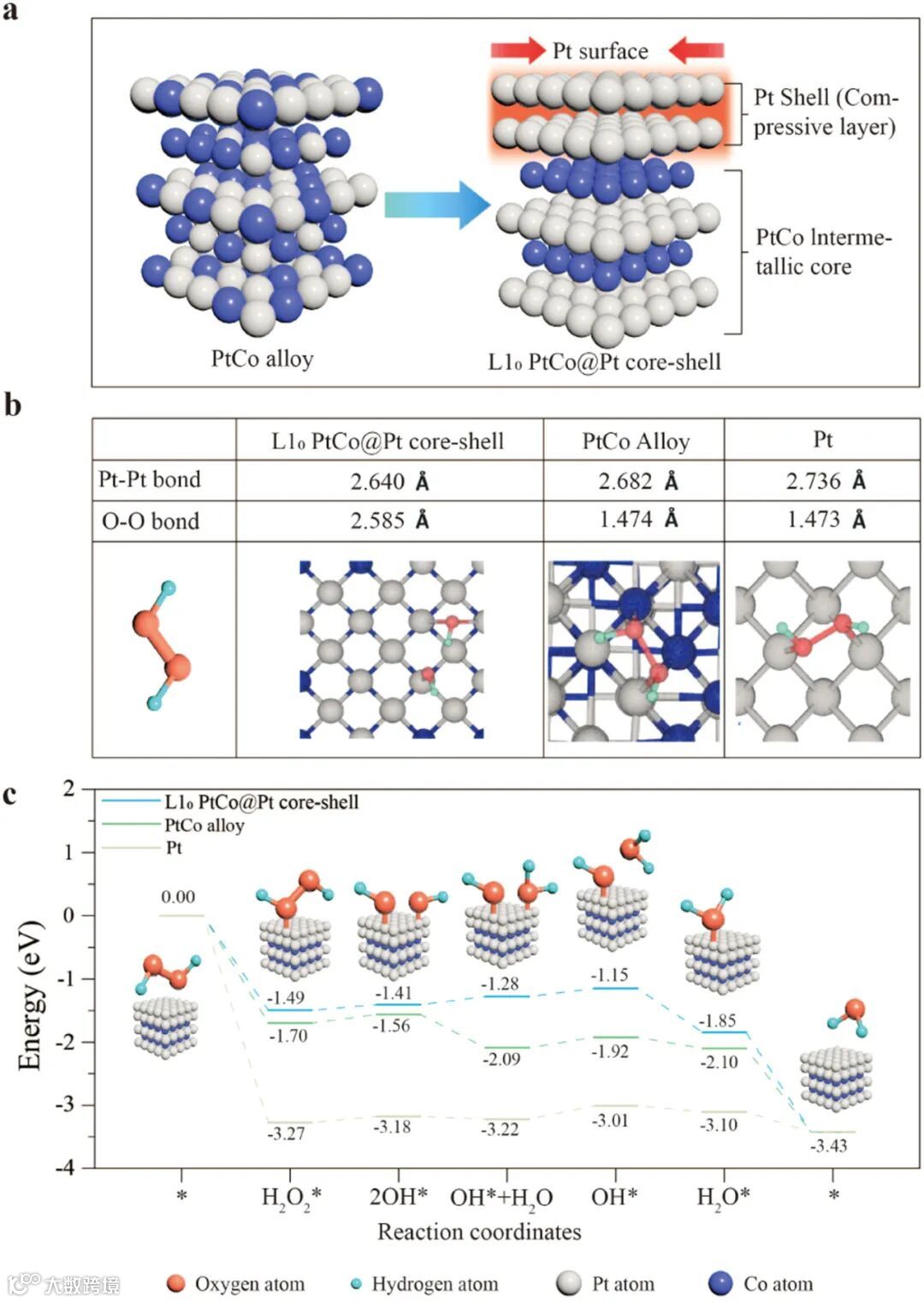 图 4 应变效应与催化机制 :密度泛函理论(DFT)计算表明,L1₀ PtCo@Pt 核壳结构借界面压缩应变(Pt-Pt 键长缩短至 2.736 Å,较纯 Pt 压缩 3.5%)使 d 带中心上移,强化反应中间体吸附。H₂O₂ 在 Pt 壳表面的 O-O 键长显著长于 PtCo 合金和纯 Pt,利于解离。反应路径能量分析显示,L1₀ PtCo@Pt 决速步能垒低于对比样品,反应热力学更优,印证应变工程对催化动力学的调控威力。