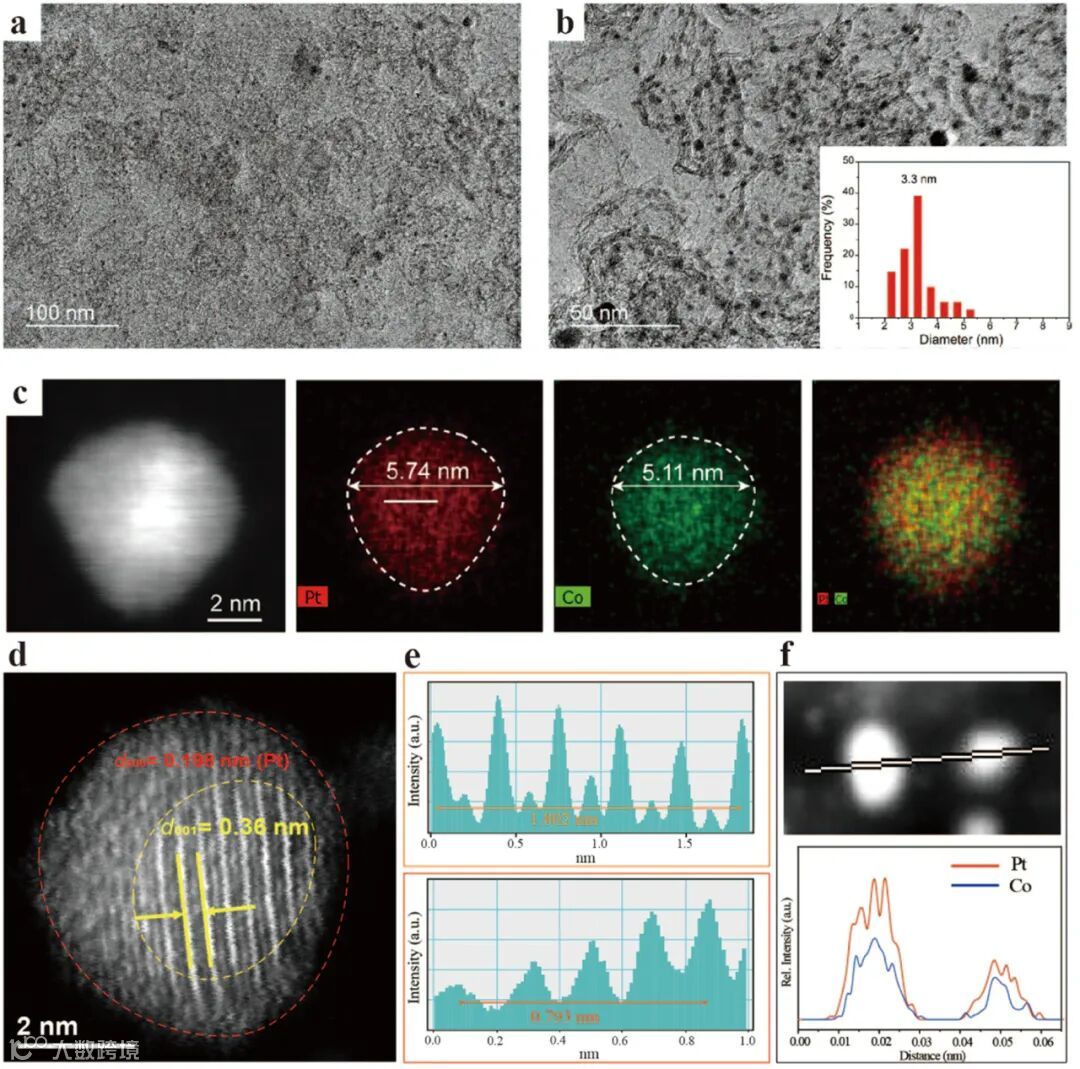 图 2 结构与成分表征 :透射电镜(TEM)与高角度环形暗场扫描透射电镜(HAADF-STEM)显示,L1₀ PtCo@Pt 纳米酶平均粒径 3.3 nm,EDS 元素分布图证实 Pt 壳层完整覆盖核表面。高分辨 TEM 呈现核层(L1₀ 相 PtCo)与壳层(面心立方 Pt)的晶面间距,傅里叶变换分析进一步验证晶体结构差异。线扫 EDS 显示 Pt 信号在核壳界面连续分布,Co 信号仅存于核区,核壳结构构建成功。