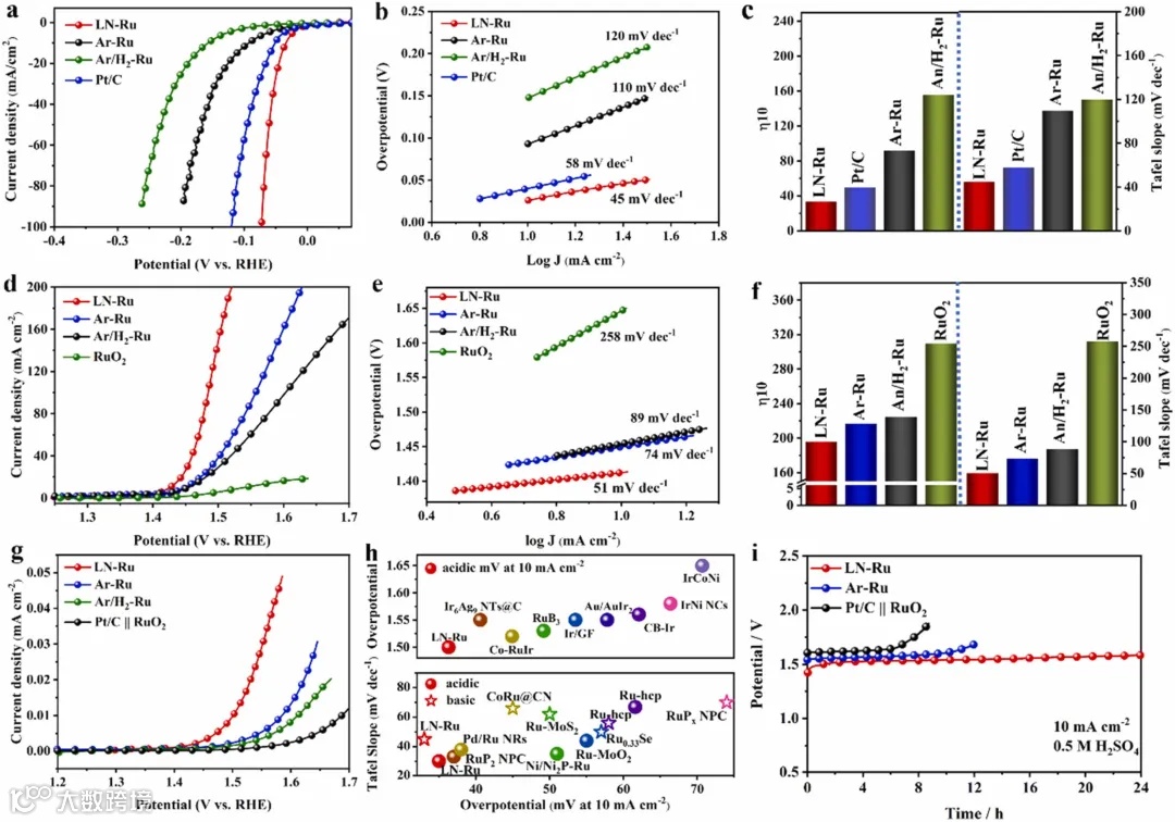 LN-Ru的HER和OER性能均表现出卓越的活性,尤其在酸性条件下HER反应动力学优于商用Pt/C催化剂(图4a-c)。