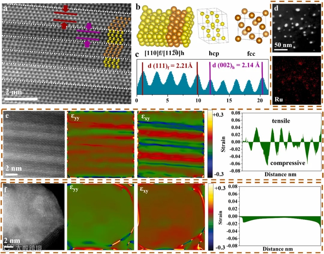 图1c-e:高分辨率透射电子显微镜(HRTEM)和选区电子衍射(SAED)模式清晰展现了SFs区域的拉伸和压缩应变,揭示了其对钌电子结构的深远影响。