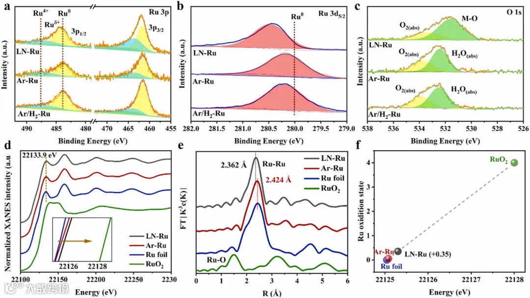 通过XPS与XAFS技术,研究了LN-Ru的表面性质及化学状态(图3a-f)。