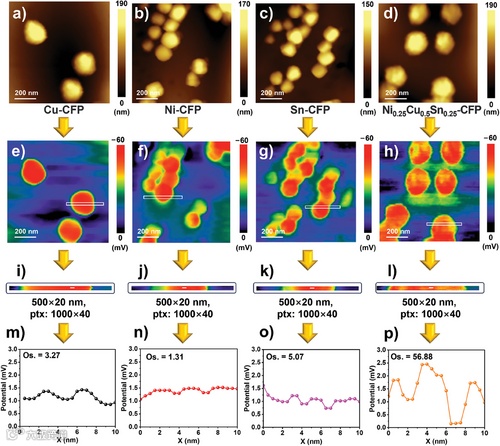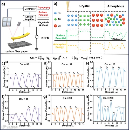 图2展示了金属玻璃的表面结构和电势分布,通过原子力显微镜(AFM)和Kelvin探针力显微镜(KPFM)分析,发现表面电势、功函数和吸附能之间存在密切关系。研究者提出了一种经验公式,定量描述表面电势变化特征,为电化学反应中的催化剂设计提供了重要依据。