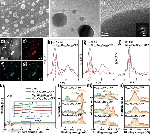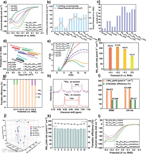 不同金属成分的合金催化剂在表面诱导产生大的表面电势振荡性,形成协同催化位点,提升了反应的催化效率。图4展示了不同样品在电解液中的线性扫描伏安(LSV)曲线,Ni0.25Cu0.5Sn0.25-CFP表现出最高的电流密度和起始电位,证明了其优异的电化学性能。