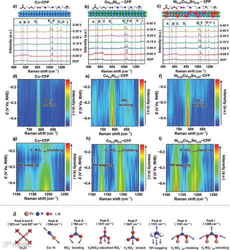 图5的原位电化学拉曼光谱分析揭示了NRA过程中的关键变化,表明Ni原子增强了NO3−的吸附能,降低了转化的活化能。