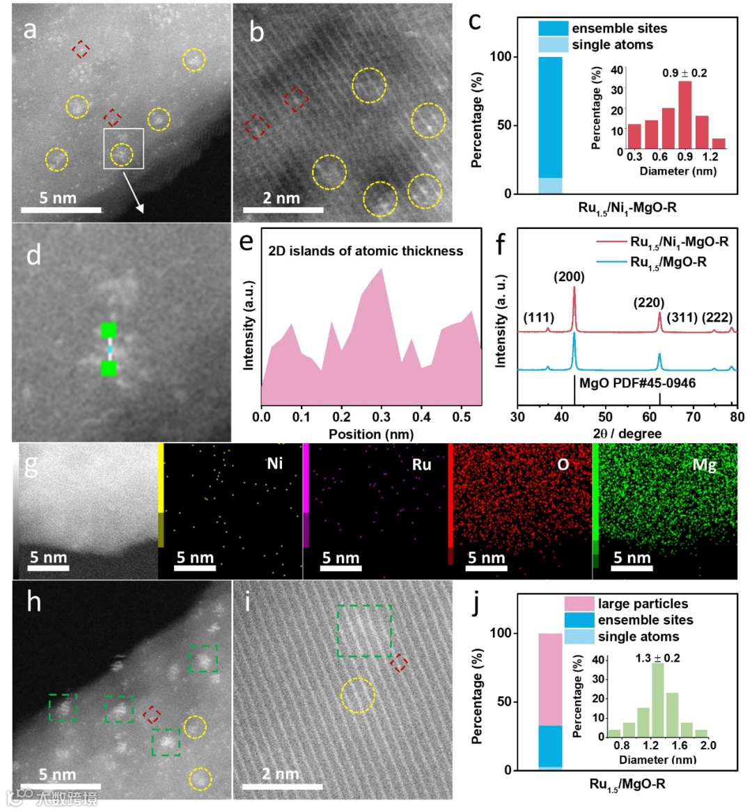 图1展示了Ru1.5/Ni1-MgO-R催化剂的高分辨STEM图像及粒径分布,与未掺杂样品相比,Ru粒子平均粒径显著减小至0.9 nm,分散性大幅提高。