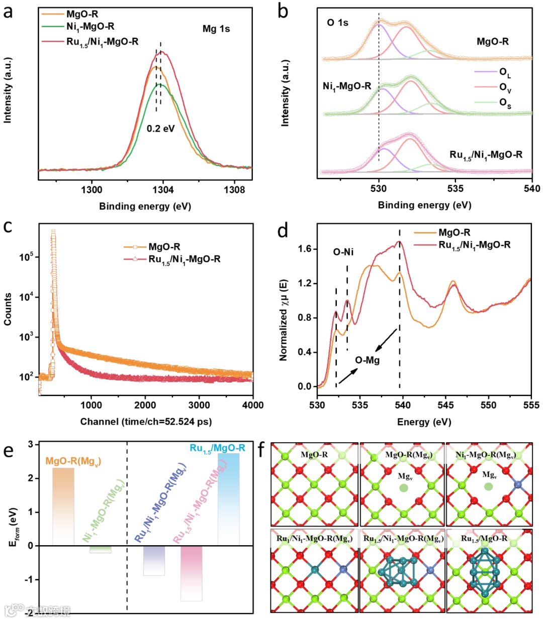 阳离子空位引入:通过Ni²⁺掺杂替代MgO中的Mg²⁺,生成Mg²⁺空位作为锚定点,显著提高亚纳米Ru粒子的分散性和抗烧结能力。 -