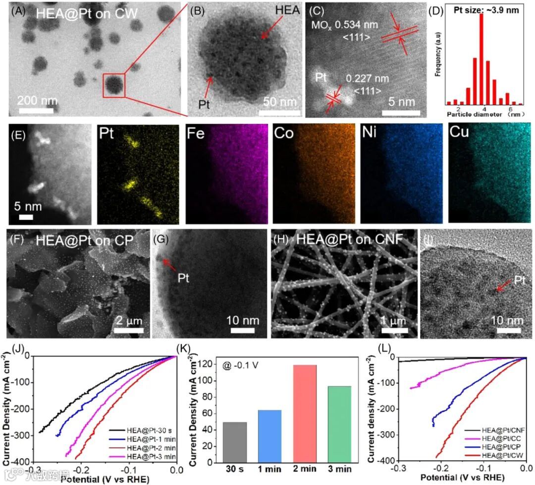 TEM图显示了HEA@Pt在CW基底上的均匀分布,以及不同碳基底(如碳布、碳纸)的适用性,展现了该催化剂设计的广泛兼容性。