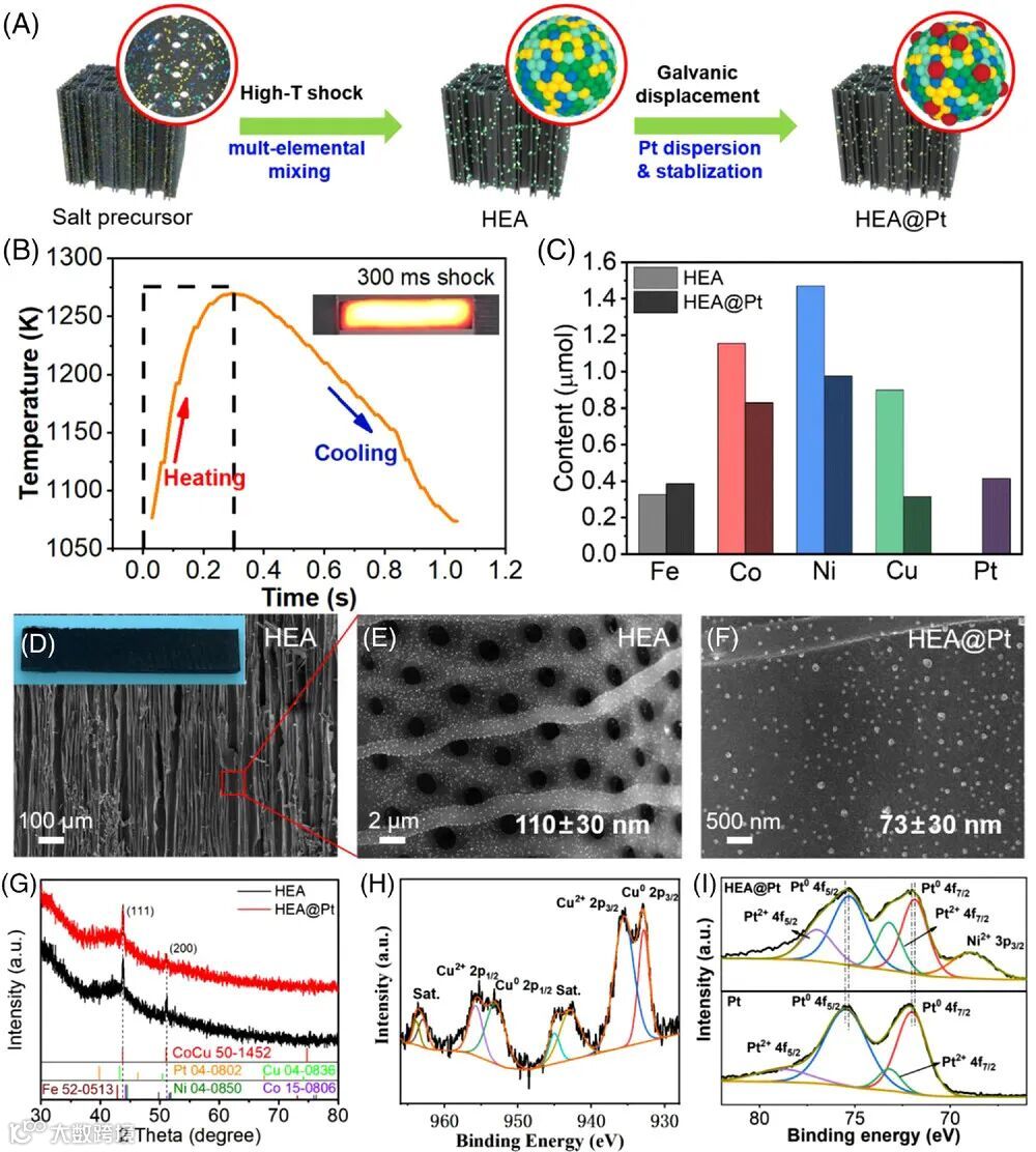 HEA@Pt催化剂的制备分两步:快速高温冲击合成和电化学置换。图2A显示了该流程的具体步骤,图2D-F的TEM图像揭示了HEA和Pt的结构特点,而图2H-I的XPS图谱揭示了催化剂中的电子转移现象。