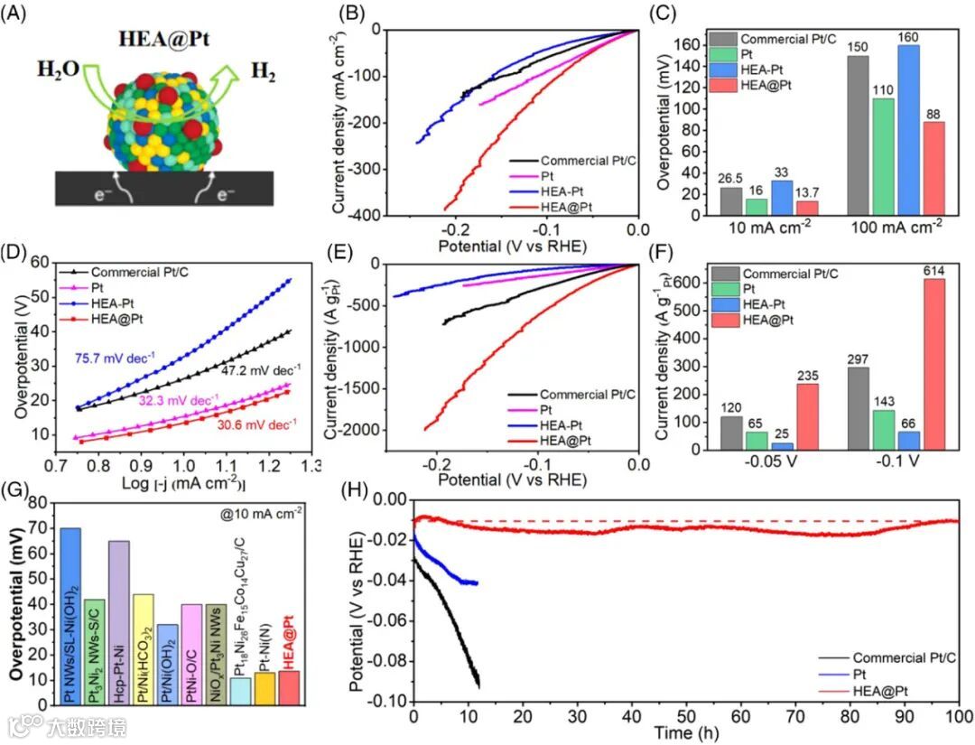 优异的电催化性能:HEA@Pt催化剂在HER和OER等反应中展现出比传统Pt/C催化剂更高的活性和稳定性,且使用更少的Pt。