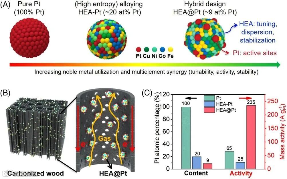 图1A清晰展示了HEA@Pt催化剂结构中的高熵合金载体与Pt纳米团簇的均匀分布。图1B展示HEA@Pt负载在碳化木(CW)基底上的独特结构优势,图1C则通过对比进一步凸显其高效性和低负载量。