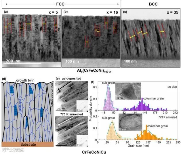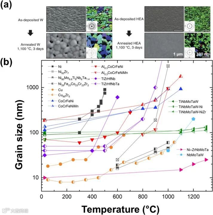 图 3 体现了 Ns - HEA 中改善的热稳定性,Ns - NbMoTaW HEA 在高温下比纳米结构的 W 展现出更高微观结构稳定性,且多种纳米结构合金体系在退火一小时后,晶粒尺寸随温度变化情况揭示了不同合金热稳定性差异,凸显高熵合金在高温环境下的应用潜力。