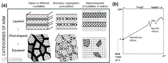 图 1 展示了根据尺寸和微观结构的 NsMs 类别示意图,以及以 NsMs 为单位的大小效应图示,揭示了相关属性 χ(n) 的大小依赖性对成分数量 n 的依赖性,体现了成分与性能间的复杂关系,为合金设计提供了基础认知。