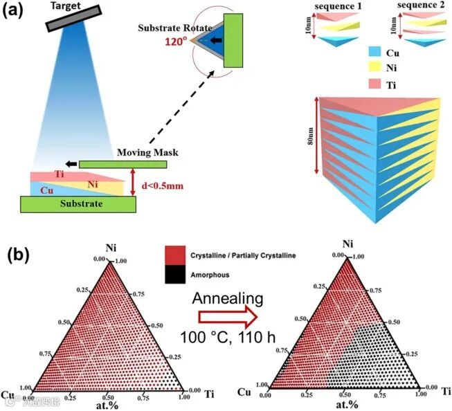 高通量方法进展 :表 2 (原文献中)总结了使用高通量方法的高熵合金代表性研究,增材制造(AM)和物理气相沉积(PVD)因灵活性在制备技术中较受欢迎。不同制备方法各有优劣,如溅射适合沉积纳米结构材料但存在厚度与沉积质量权衡问题,定向能量沉积(DED)和激光粉末床熔化(LPBF)在高熵合金库制备中面临不同挑战。在成分选择方面,CrFeCoNi 和 CrMnFeCoNi 等基础材料广泛研究,添加不同元素可引发结构转变与性能提升,如NbMoTaW 体系表现出高强度和热稳定性但延展性有待提高,TiZrHfNbTa 体系则展现出优异块体塑性。