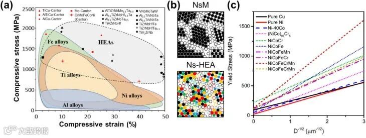 图 2 对比了传统合金与高熵合金在应力 - 应变曲线中的力学性能,通过 NsMs 和 Ns - HEA 示意图以及低熵、中熵和高熵 3d 过渡金属合金的 Hall - Petch 关系,直观呈现高熵合金力学性能优势,彰显其在材料强度等方面的优异表现。
