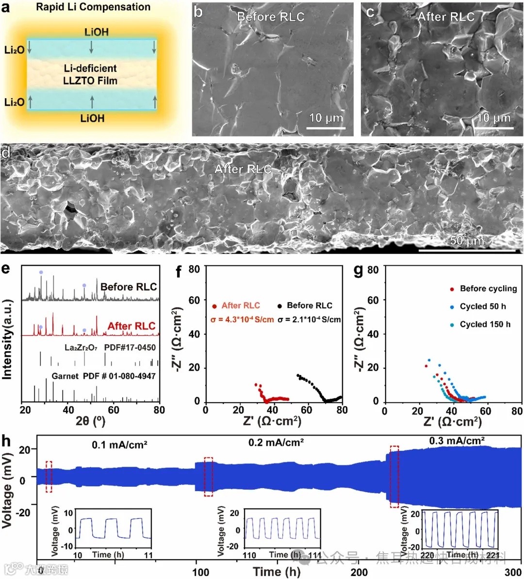 图5 展示了RLC技术对LLZTO薄膜微观结构和电化学性能的影响。RLC处理后的LLZTO薄膜不仅保持了致密的微观结构和平表面(图5b-d),而且离子导电性显著提高(图5e和f)。此外,Li/LLZTO/Li对称电池的循环性能测试表明,RLC处理的LLZTO薄膜在循环300小时后仍能保持较低的电阻,显示出优异的循环和界面稳定性(图5h)。