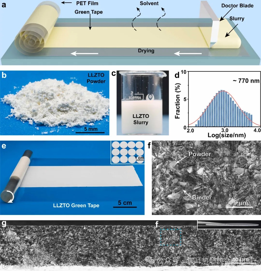 图2 详细描述了LLZTO绿色带材的带铸工艺流程。通过球磨机研磨LLZTO粉末,使其粒径分布均匀(图2d),并使用聚乙烯醇丁醛(PVB)聚合物调整浆料浓度,以增加墨水的粘度和润湿性(图2c)。这一步骤对于保证绿色薄膜的完整性至关重要。随后,通过等静压处理增加绿色带材的密度,为后续的烧结过程打下了基础(图2e)。