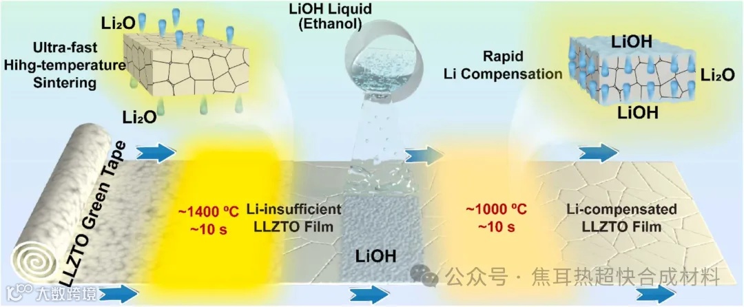 锂金属因其高理论比容量和低电化学电位而被视为高能量密度锂电池的理想负极材料。固态电解质(SSEs),特别是氧化物基的锂离子导体如Li6.4La3Zr1.4Ta0.6O12(LLZTO),因其高离子导电性和优异的综合性能成为全固态电池(ASSBs)的关键材料。然而,现有制备工艺在保持薄膜的高离子导电性和平整性方面存在挑战,主要是由于锂的损失和薄膜的脆弱性。传统的真空沉积技术和溶液基技术虽然能够制备石榴石型SSE薄膜,但存在离子导电性降低和锂蒸发损失的问题。为了克服这些限制,本研究提出了一种快速锂补偿(RLC)技术,通过带铸技术和超快速高温烧结(UHS)技术相结合,成功制备了具有高离子导电性和平整表面的LLZTO薄膜,为高性能ASSBs的发展提供了新的可能性。