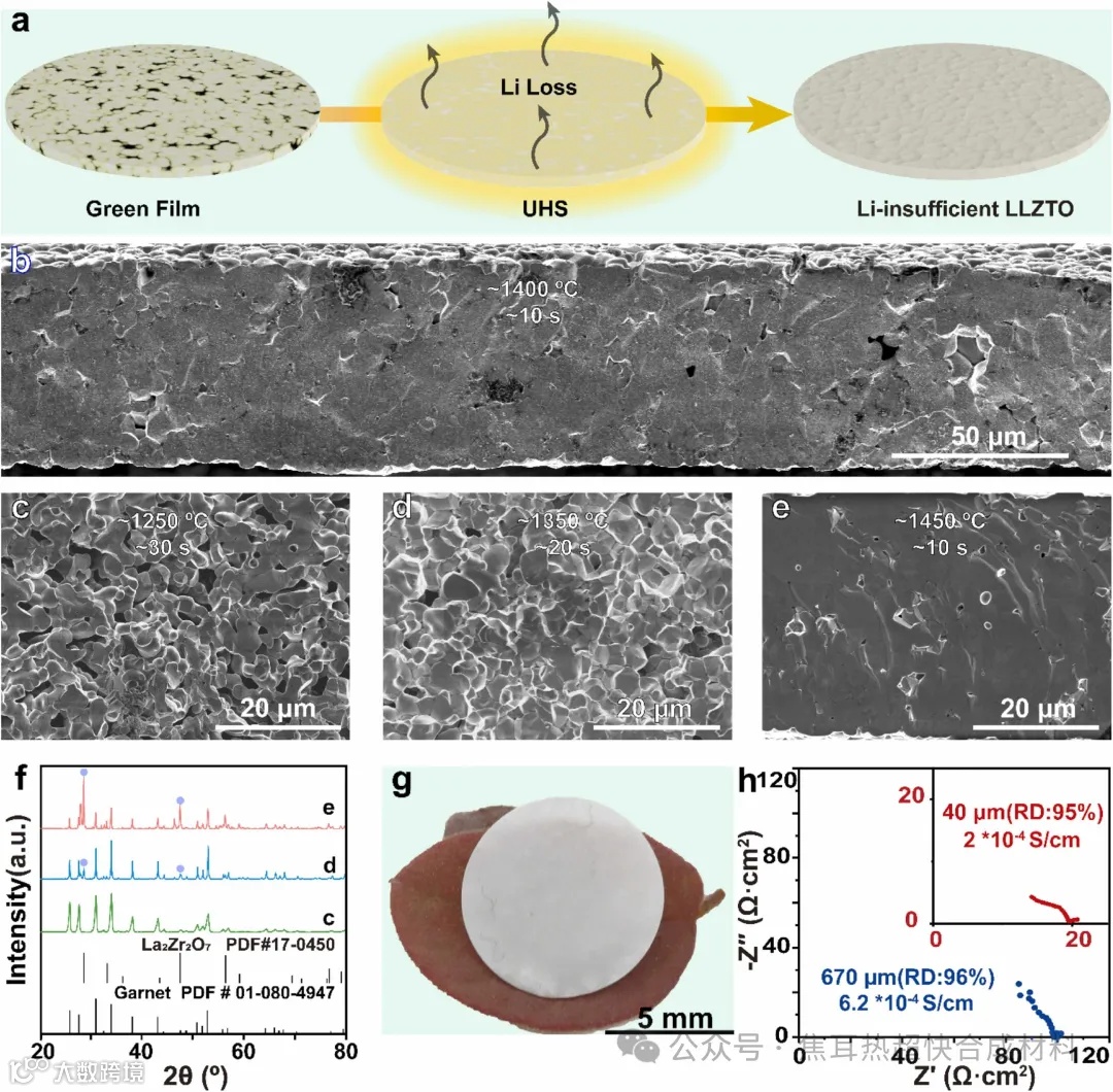 图3 揭示了UHS烧结过程中LLZTO薄膜的微观结构和相变。研究表明,通过优化烧结温度和时间,可以有效减少锂损失并提高薄膜的致密性(图3b和e)。然而,高温下锂的蒸发率增加,导致了La2Zr2O7(LZO)次生相的形成,这是薄膜离子导电性降低的主要原因(图3f)。