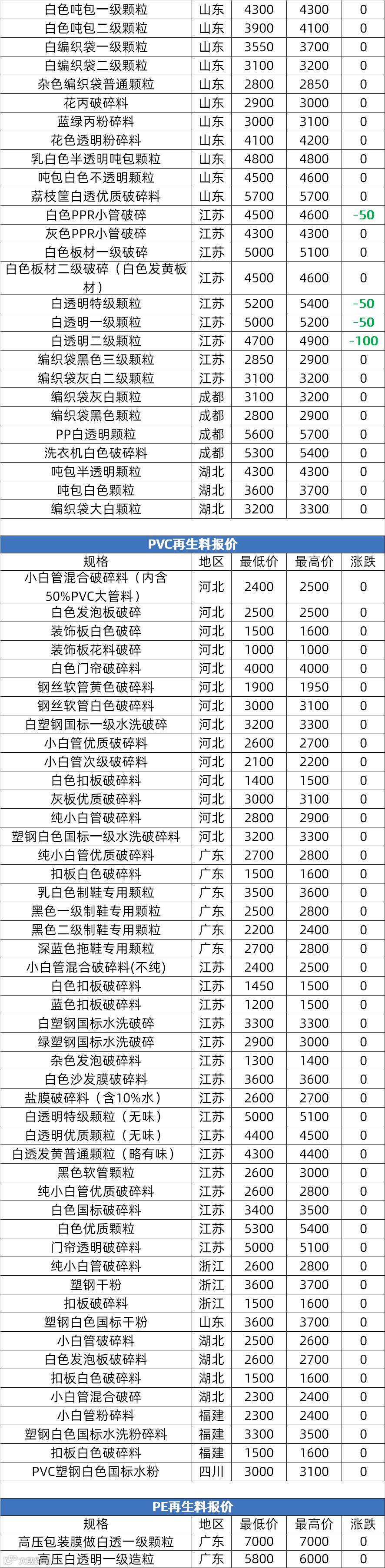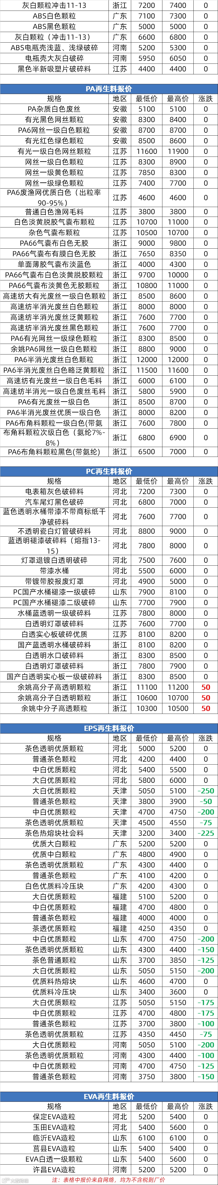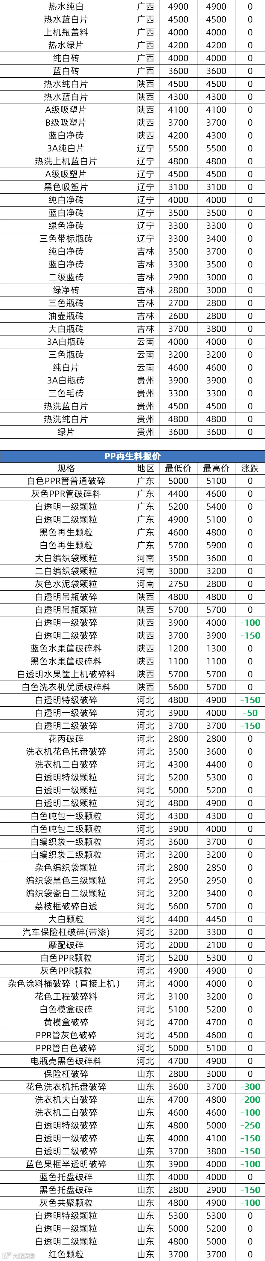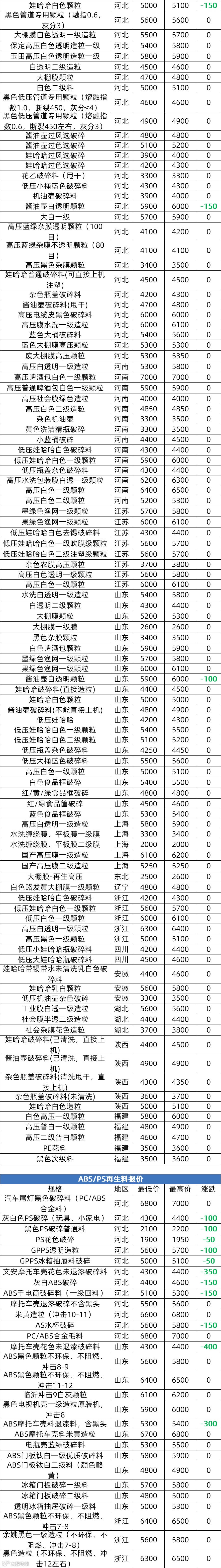 再生ABS山东市场报盘平稳为主,下游备货延续刚需,制品企业随用随采,备货积极性不高,实单议价成交。再生ABS/PS江苏市场交易气氛不高,市场交投零星,下游备货心态谨慎,短期需求疲态难改,企业随行就市出货,调盘心态谨慎。再生ABS浙江市场报盘平稳为主,终端需求释放缓慢,备货心态谨慎,老客户刚需采购为主,实单议价成交。广东再生ABS市场淡稳整理运行,下游需求释放缓慢,备货心态谨慎,市场交易节奏放缓,实单议价成交。再生ABS/PS河北市场淡稳整理运行,需求面试放缓慢,备货心态谨慎,实单议价成交。