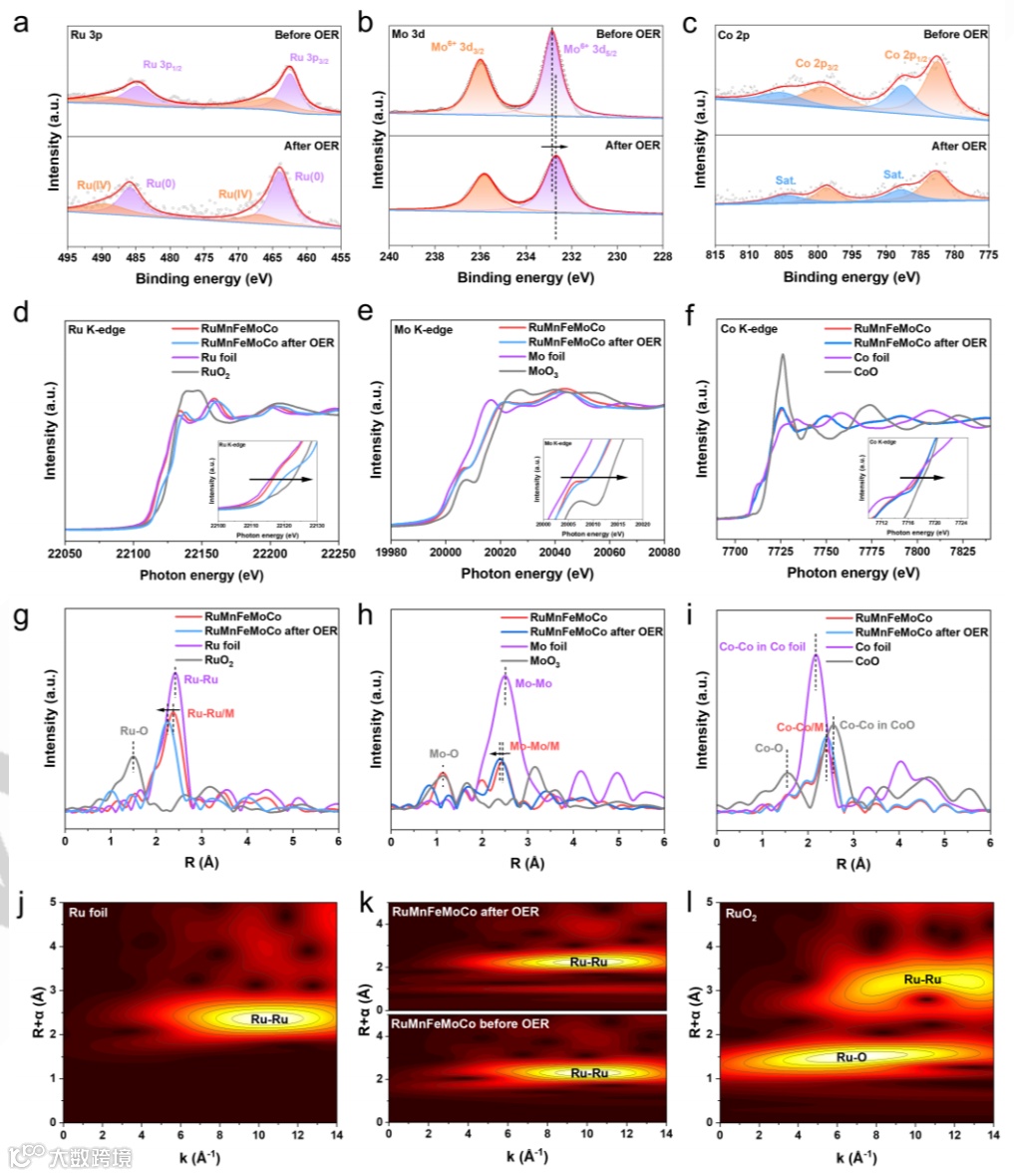 X射线吸收谱分析:X射线吸收近边结构(XANES)分析表明,Fe、Mo和Co的吸收边前缘向更高光子能量方向移动,表明这些金属元素在高熵合金中的氧化态升高,而Ru的氧化态接近0。扩展X射线吸收精细结构(EXAFS)分析进一步揭示了高熵原子的配位结构,表明在OER过程中,Ru、Mo和Co位点的局部配位结构由于氧物种的吸附而发生了重新排列,但核心Ru、Mn和Co物种的结构保持稳定。