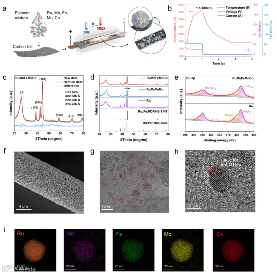 合成过程:通过快速焦耳加热法成功制备了负载在碳毡(CF)上的五元高熵Ru基合金(RuMnFeMoCo@CF)催化剂。将含有五种金属盐的前驱体均匀混合后溶解于去离子水中,将CF浸入前驱体溶液中5分钟并烘干,随后通过精确控制电压、电流和时间进行高温加热。