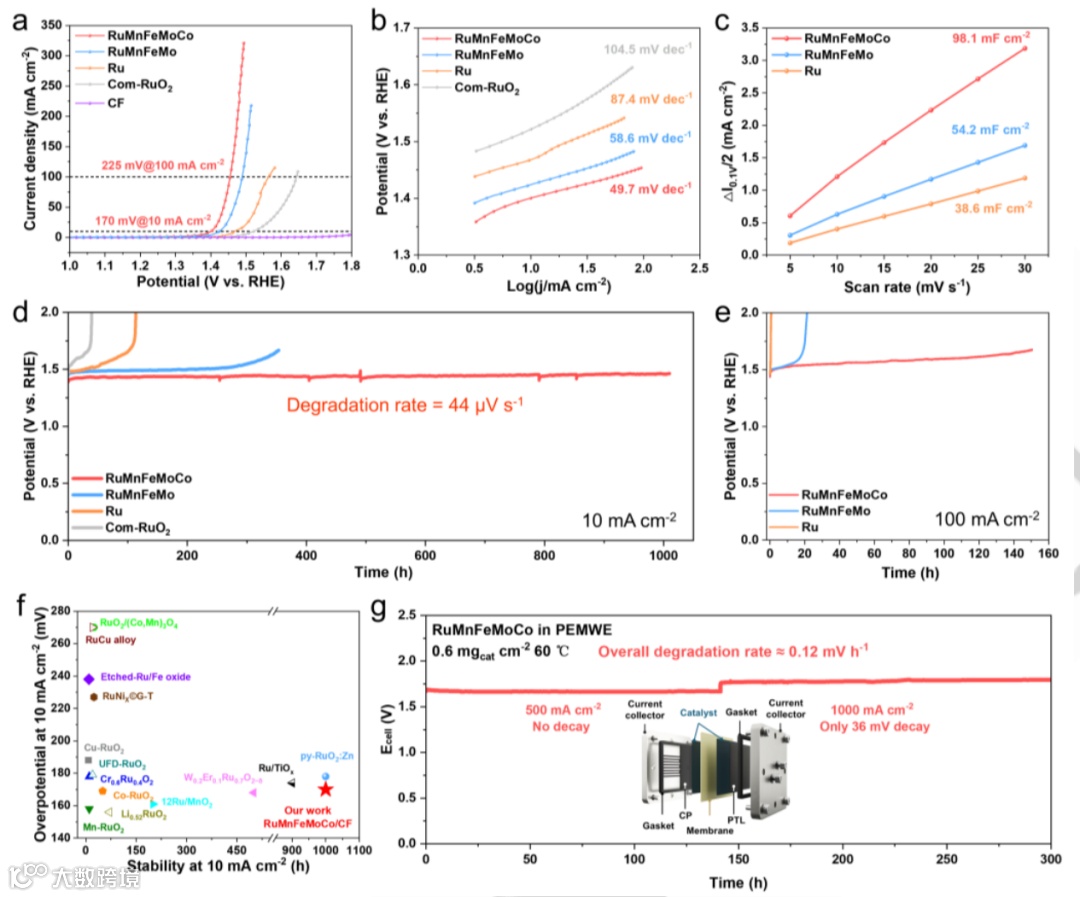多元素协同作用:Ru、Mo和Co等耐腐蚀元素的引入显著提高了催化剂的稳定性,而Mn、Fe和Co的存在降低了OER过程中的能垒,加速了反应动力学。