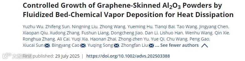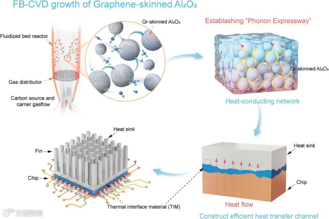 电子设备小型化、高功率化带来的散热难题如何破解?热界面材料(TIM)是关键!北京大学刘忠范院士团队在《Advanced Science》发表创新成果:利用流化床化学气相沉积(FB-CVD)技术,成功为氧化铝(Al₂O₃)粉末披上高质量、连续的石墨烯“外衣”,制备出导热性能大幅跃升的复合粉末及热界面材料。这项技术攻克了高质量石墨烯复合材料可控制备难题,为下一代电子器件散热带来新希望。