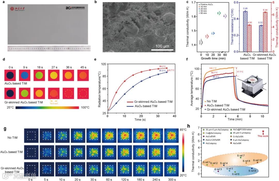 性能对比 (图4h): 该 TIM 在同类 Al₂O₃ 基材料中导热性能领先。