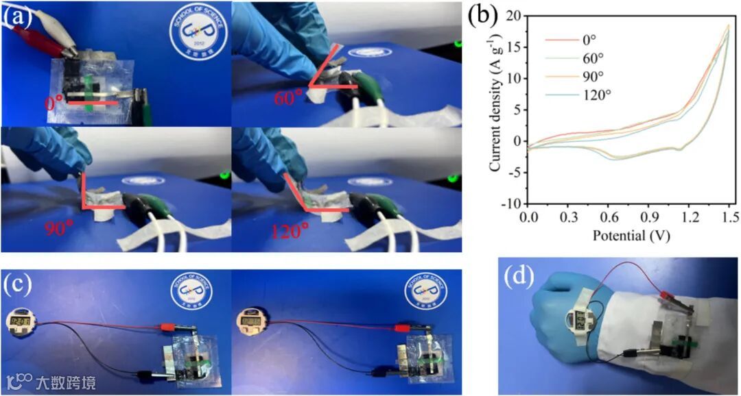 图6展示了Ni₃S₂-NiO@BP//AC HSC在不同弯曲角度下的电化学性能及其在可穿戴设备中的应用潜力。即使在弯曲状态下,HSC的电化学性能也几乎不受影响,显示出良好的柔韧性和稳定性。此外,HSC能够为电子手表供电超过30分钟,并且可以集成到可穿戴设备(如手环)中。