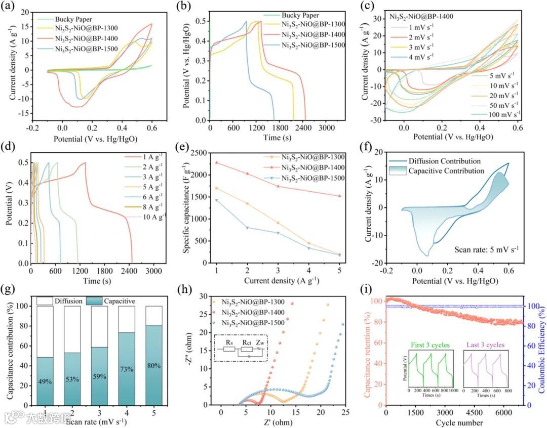 图2系统地展示了Ni₃S₂-NiO@BP电极材料在三电极体系中的电化学性能。循环伏安(CV)和恒流充放电(GCD)曲线对比了BP和不同热处理温度下Ni₃S₂-NiO@BP的电化学行为。结果显示,经过焦耳热处理的Ni₃S₂-NiO@BP表现出明显的法拉第伪电容行为,其CV曲线呈现出清晰的氧化还原峰,而BP则主要表现出双电层电容特征。其中,Ni₃S₂-NiO@BP-1400在1A/g的电流密度下展现出最高的比电容2278F/g,即使在10A/g的高电流密度下仍保持1080F/g,远高于其他样品。