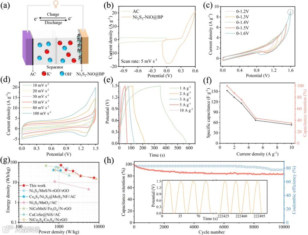 图5展示了基于Ni₃S₂-NiO@BP和活性炭(AC)组装的非对称超级电容器(HSC)的电化学性能。HSC在0~1.5V的电压范围内表现出良好的电容响应,其比电容在1A/g时达到153F/g,即使在10A/g的高电流密度下仍保持53F/g。此外,HSC在15A/g的电流密度下经过10000次循环后,比电容保持率为83%,显示出良好的循环稳定性。